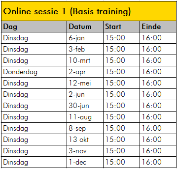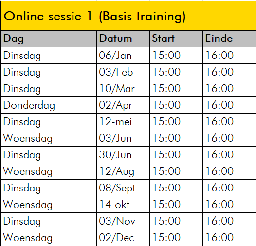Deze training volg je thuis in je eigen tijd met één contactmoment voor vragen. De eerstvolgende trainingen zijn: