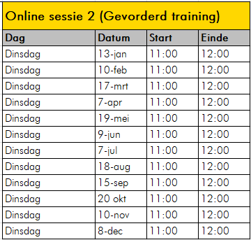 De e-learning volg je thuis in je eigen tijd met één contactmoment voor vragen. De dag op locatie wordt eens per maand gegeven. De eerstvolgende trainingen zijn: