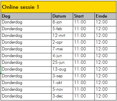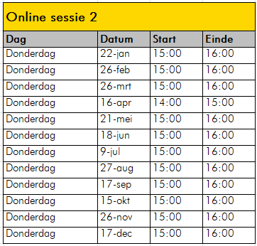 Deze training volg je in één tot anderhalve dag online wanneer het jou uitkomt. Om eventuele vragen te beantwoorden en ervoor te zorgen dat je alles goed verloopt, organiseren we periodiek 2 online vragenuren (waarvan 1 verplicht) waarvoor je je kunt aanmelden. De eerstvolgende sessies zijn: